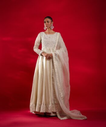 Embrace ethereal elegance with this pristine white pishwas crafted in lustrous Sheesha silk, adorned with delicate monotone white embroidery and paired with pure organza dupatta. Flowing gracefully with every step, it’s a timeless masterpiece of subtle sophistication and regal charm.