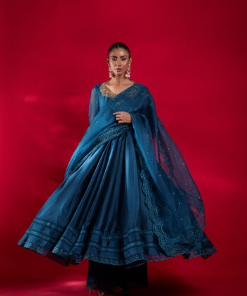 Draped in soft hues, this exquisite ensemble CELINE from the Leyla Collection embodies understated luxury. A finely crafted organza shirt with delicate, minimal embroidery pairs seamlessly with sheesha silk pants and a gossamer silk-net dupatta, a symphony of texture, grace, and refined sophistication.