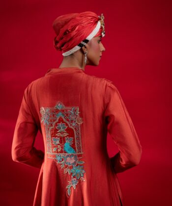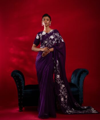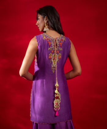 This enchanting purple ensemble features a pure silk shirt adorned with vibrant multi-colored embroidery, paired elegantly with sheesha silk bottoms. The contrasting net dupatta adds an ethereal touch, creating a perfect balance of bold artistry and refined sophistication. A celebration of color & texture.