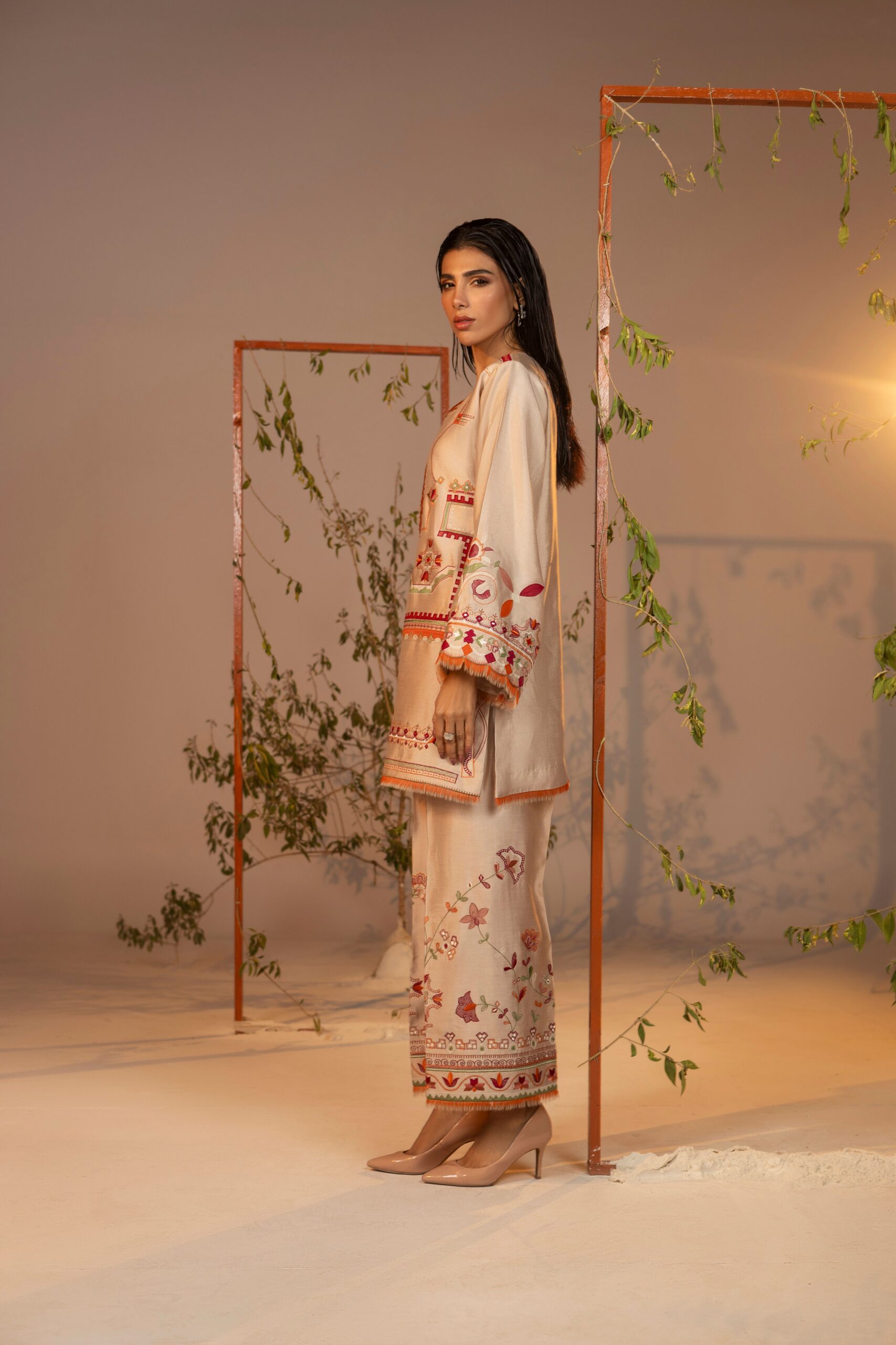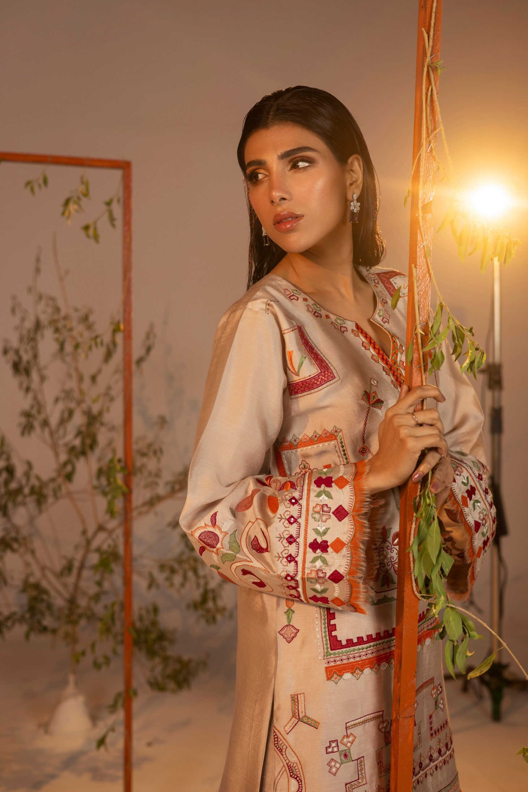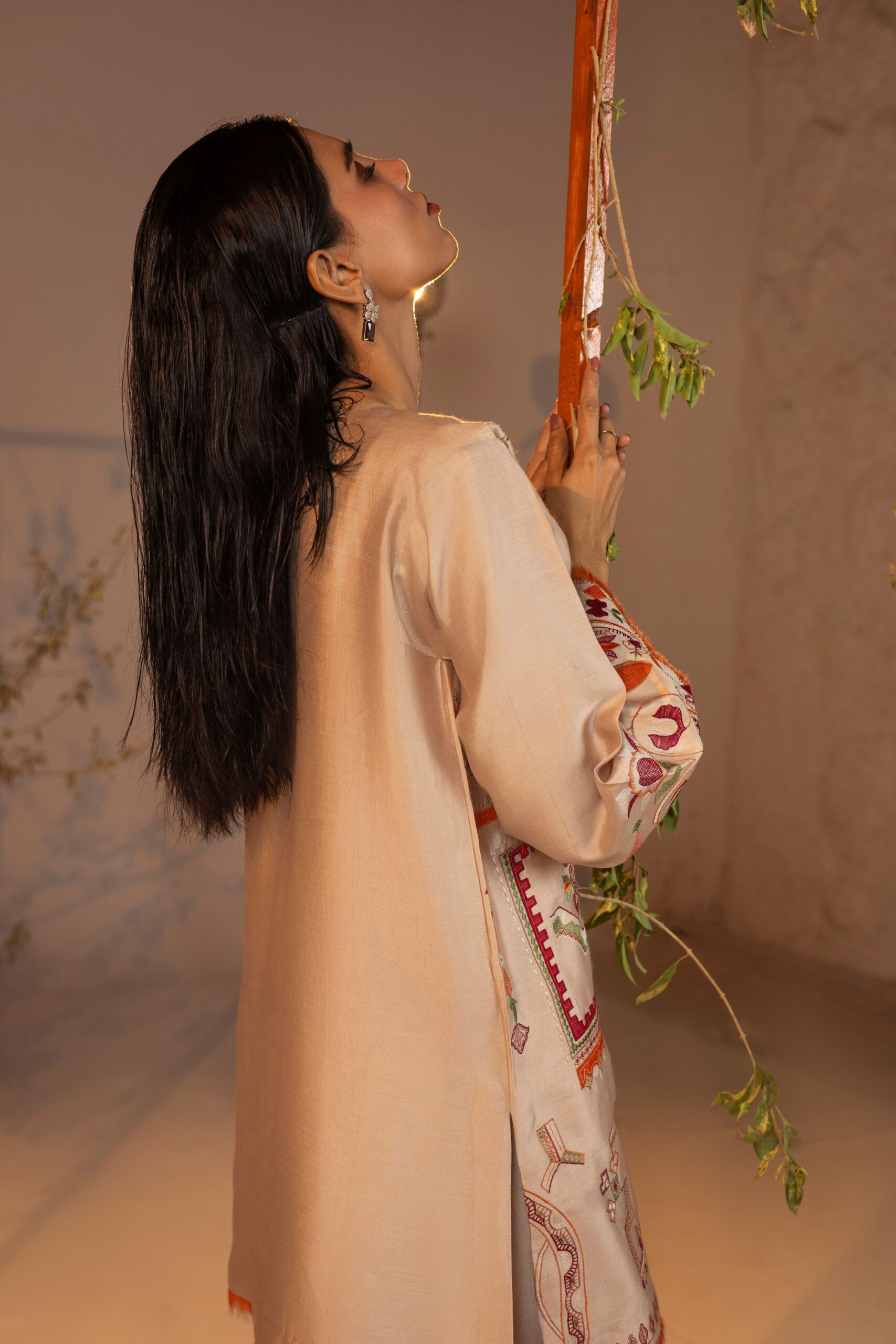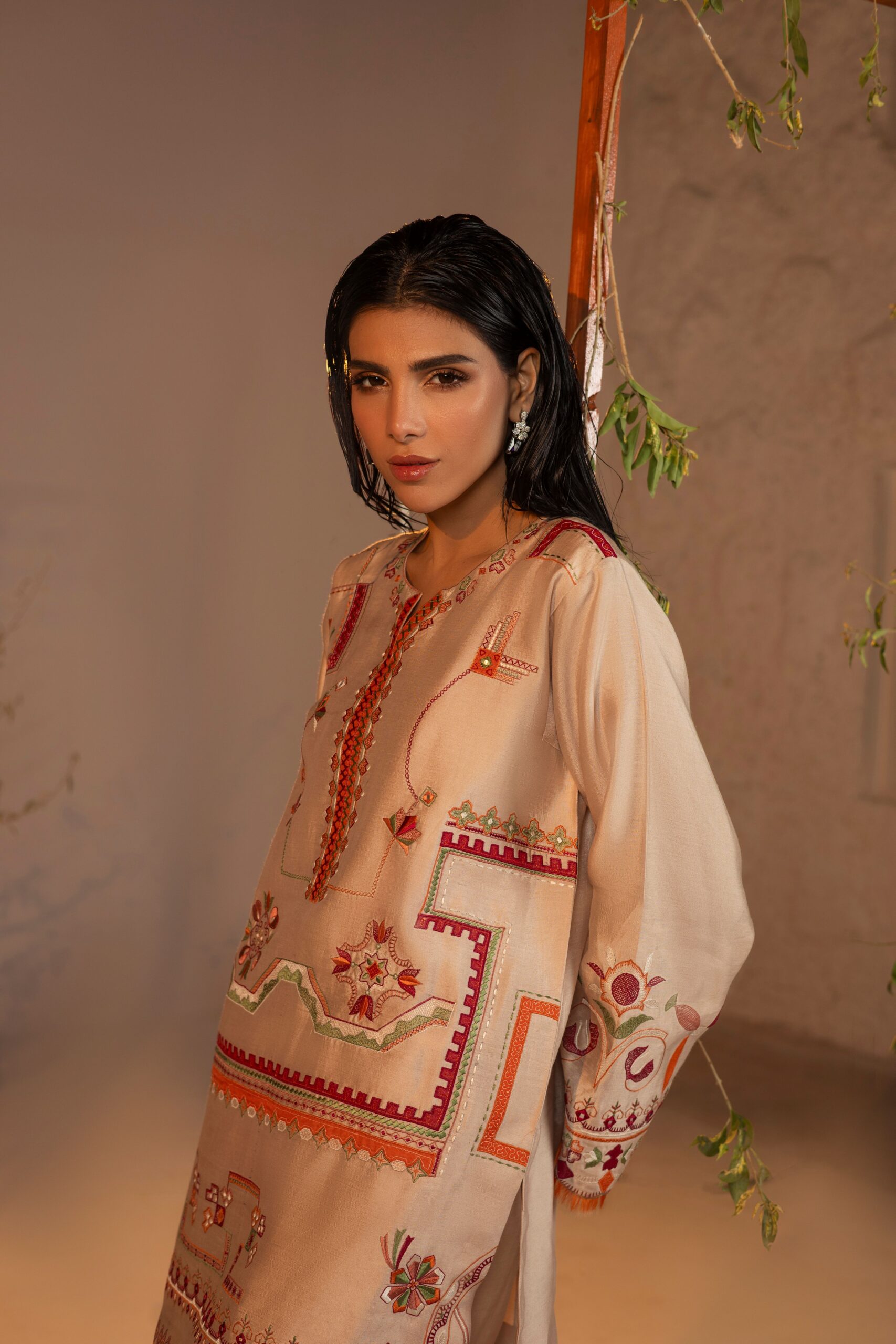 Rendered in soft sheesha cotton, Imara blends comfort with sophisticated style. The medium-length shirt silhouette, paired with tailored trousers, offers a modern, graceful look. Intricate multi-thread appliqué embroidery adorns the front, sleeves, and trousers, adding texture and artisanal elegance.