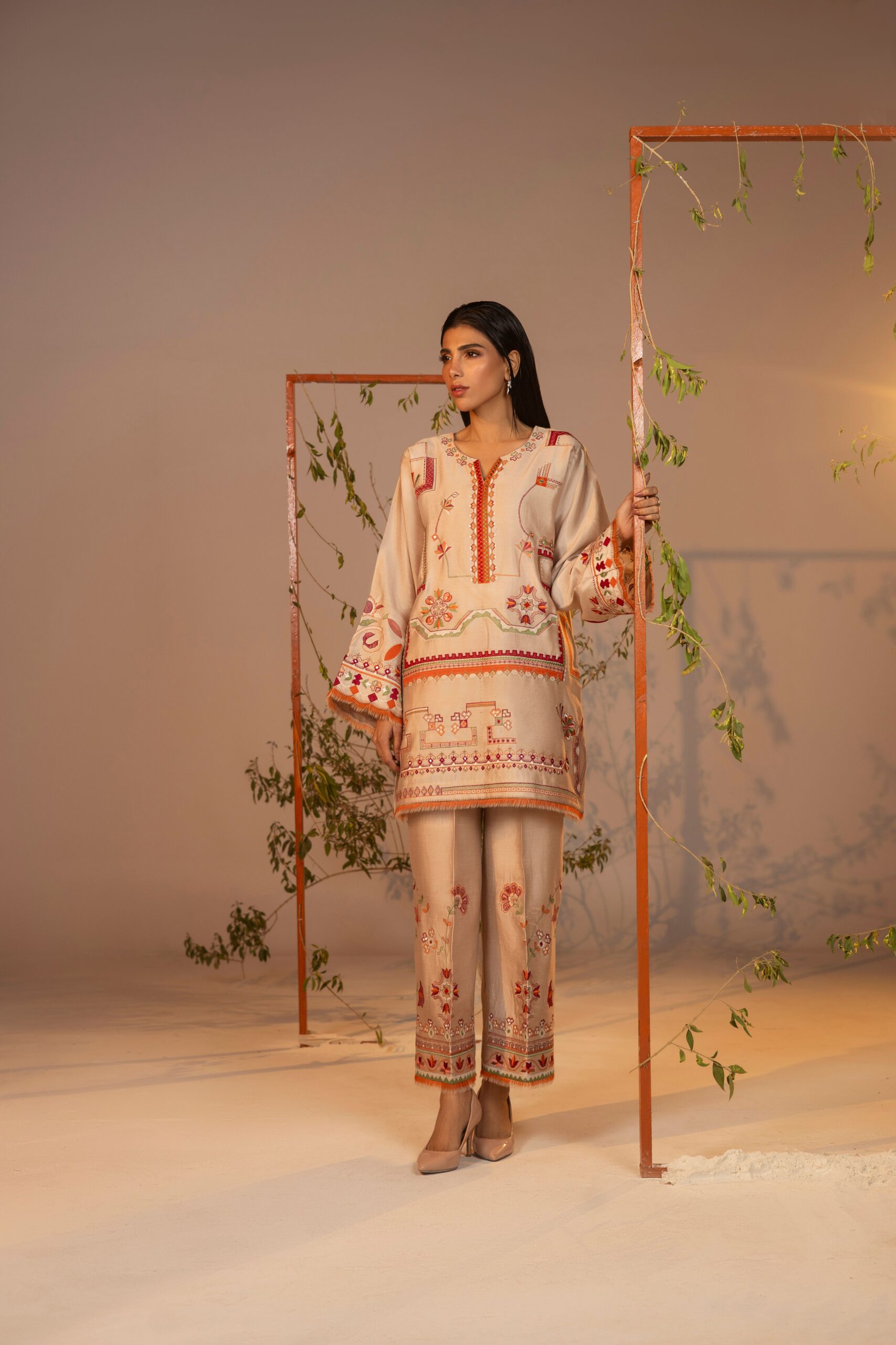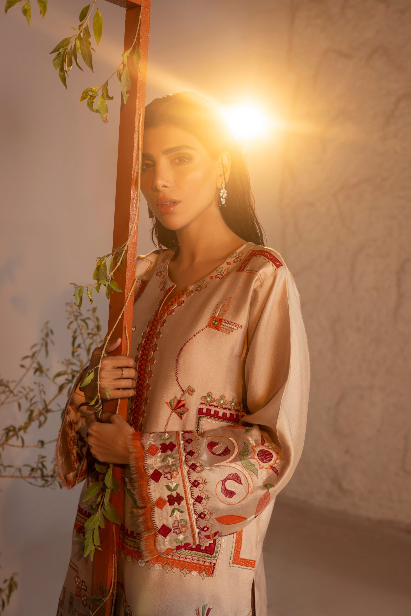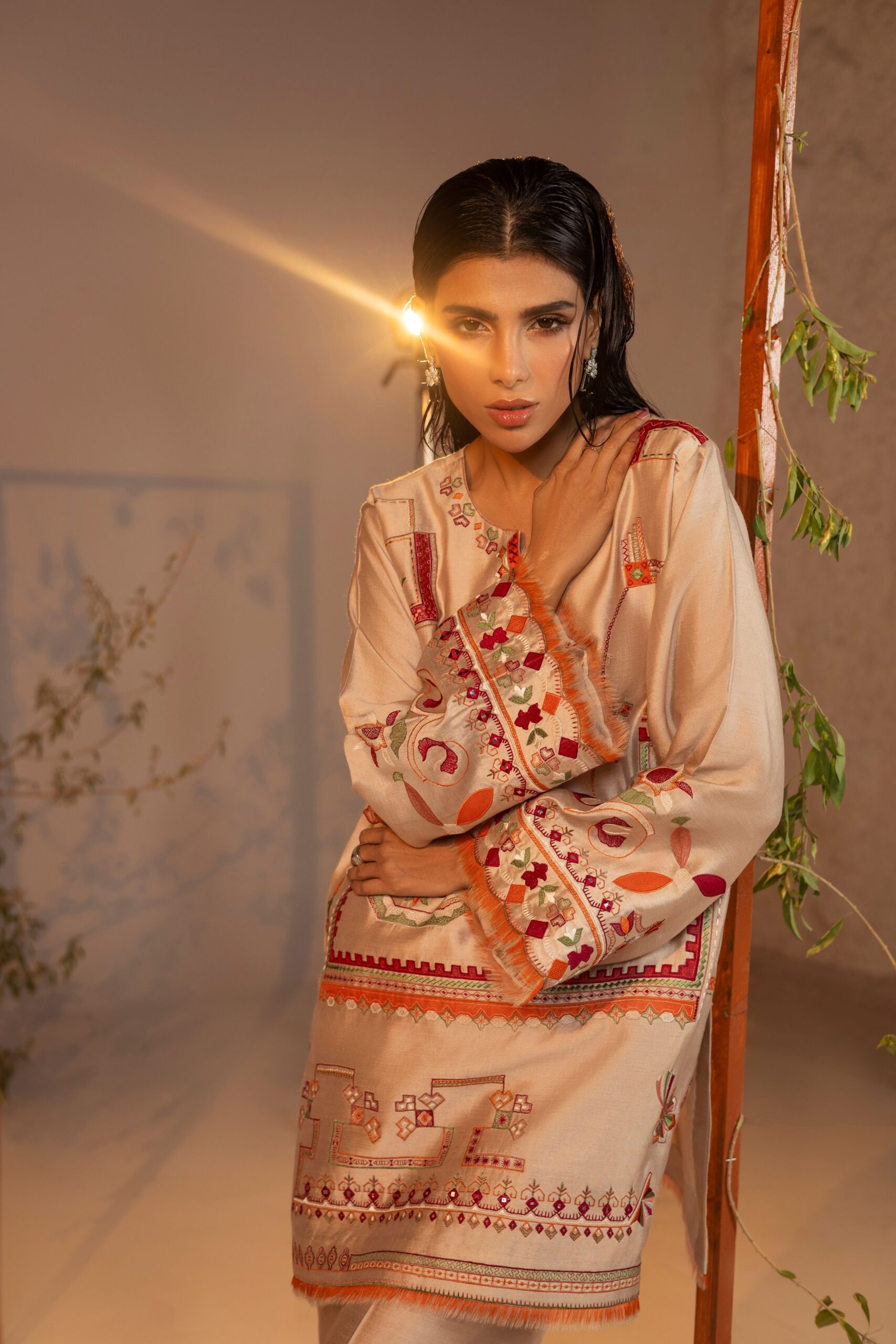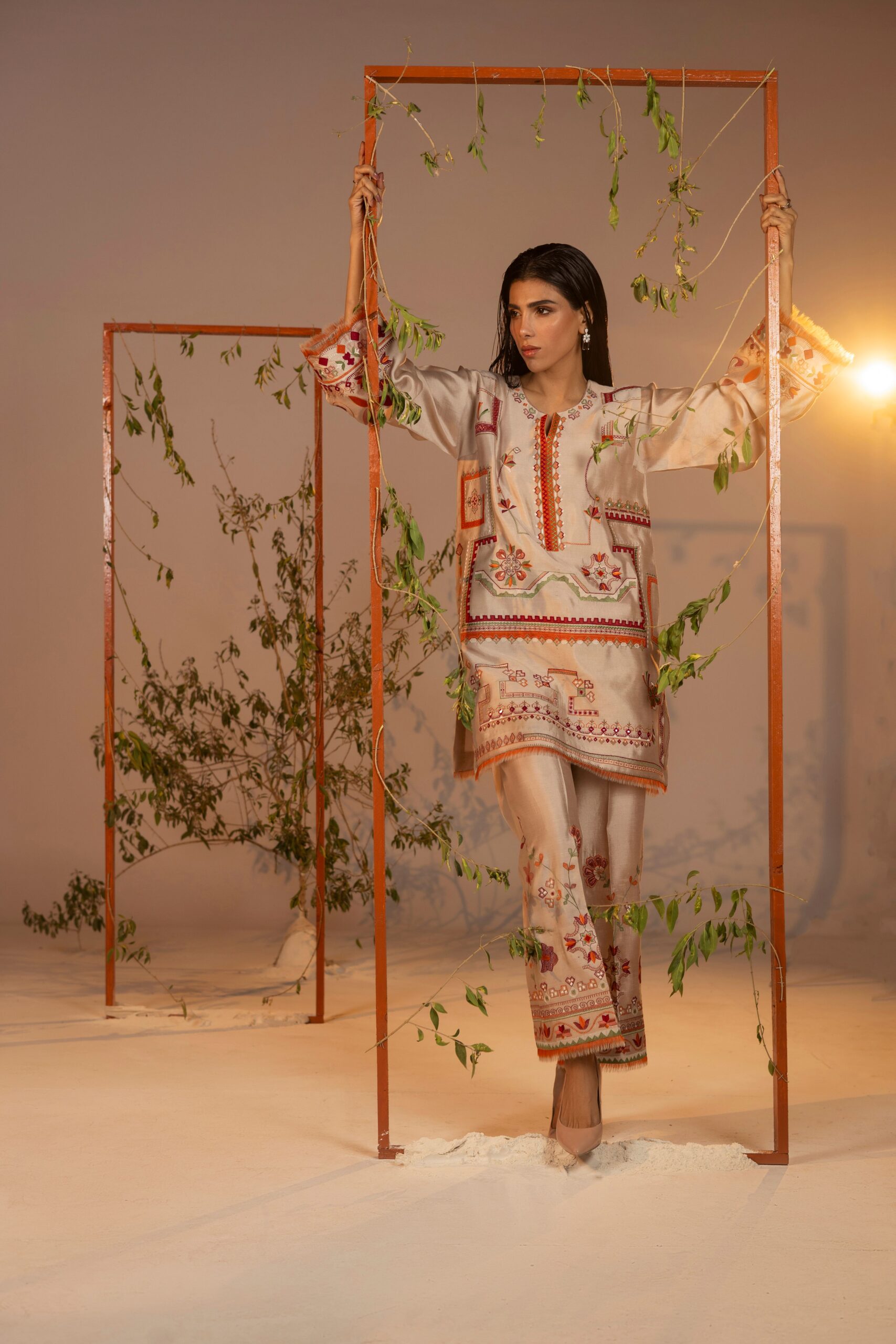 Rendered in soft sheesha cotton, Imara blends comfort with sophisticated style. The medium-length shirt silhouette, paired with tailored trousers, offers a modern, graceful look. Intricate multi-thread appliqué embroidery adorns the front, sleeves, and trousers, adding texture and artisanal elegance.