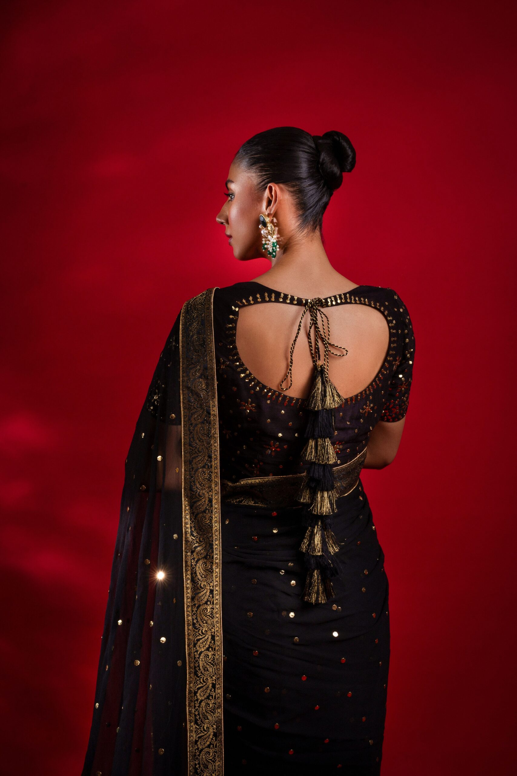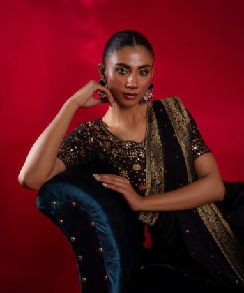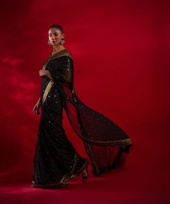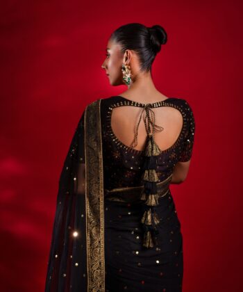 Command the spotlight in this mesmerizing black pure chiffon saree, adorned with intricate metallic embroidery that shimmers with every movement. The saree is accentuated with a luxurious jamawar border on all four sides, adding a regal charm to its ethereal drape. Paired with a stunning blouse featuring delicate mukesh work, Soraya perfectly blends timeless grace with contemporary allure — designed for those who dare to dazzle.