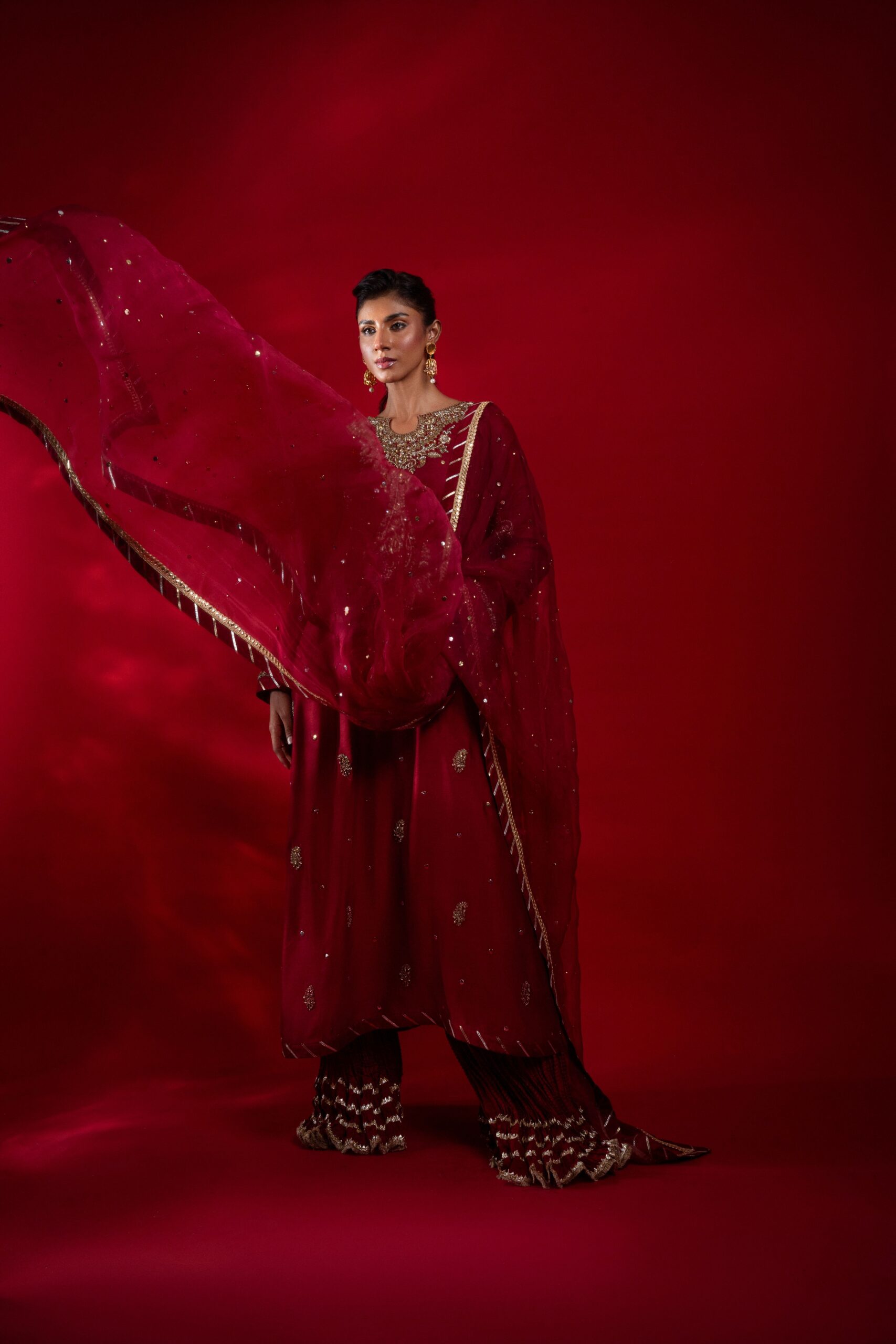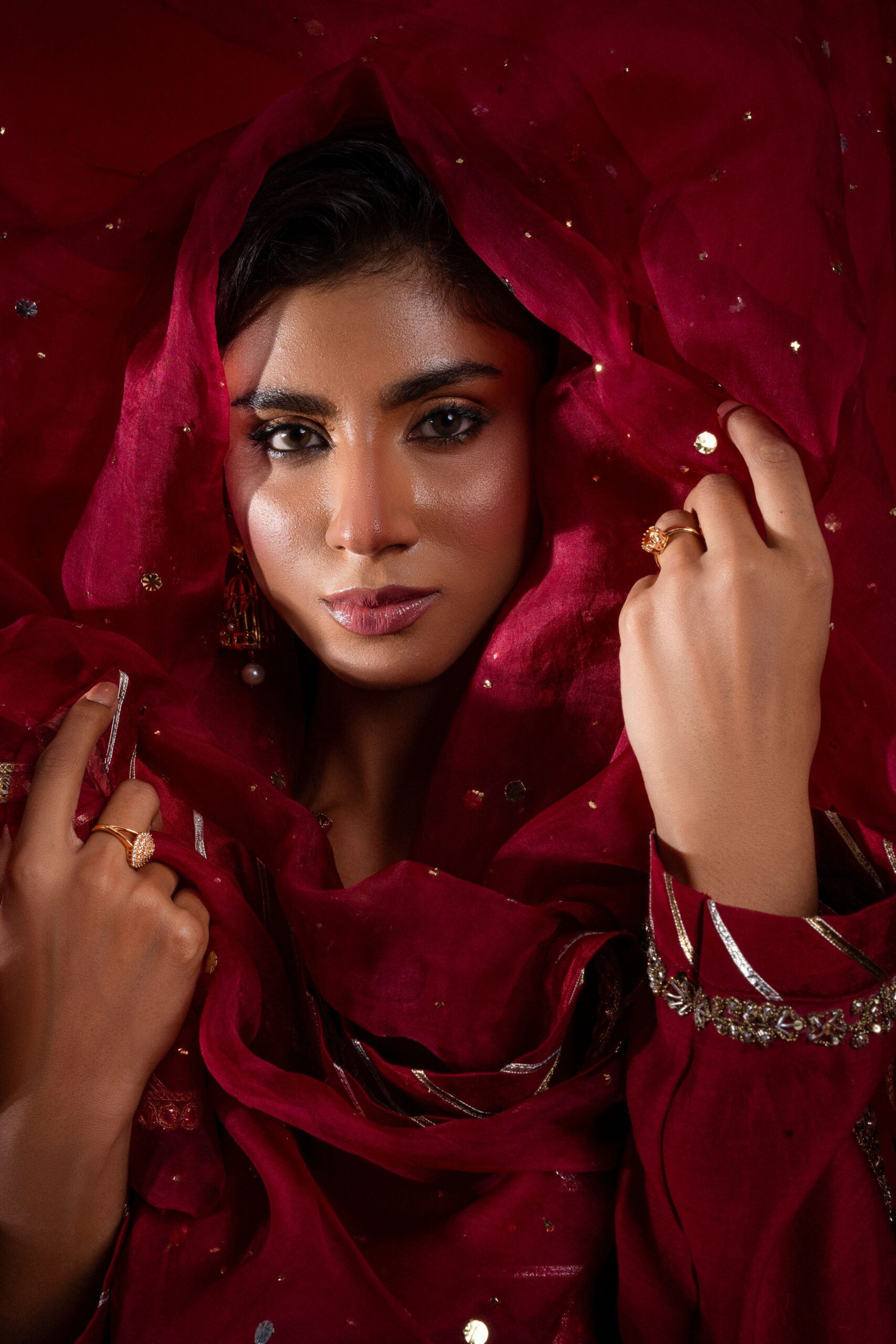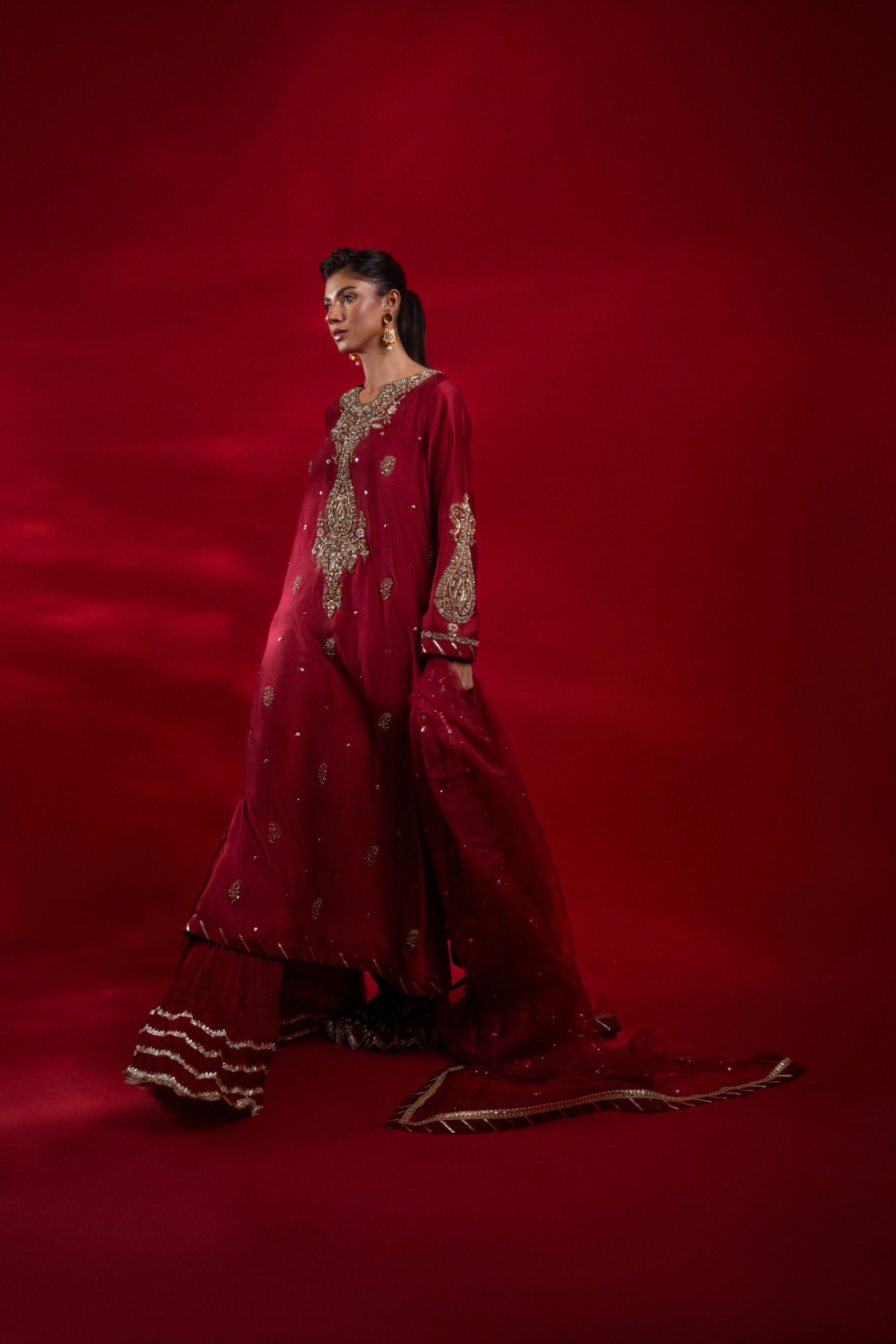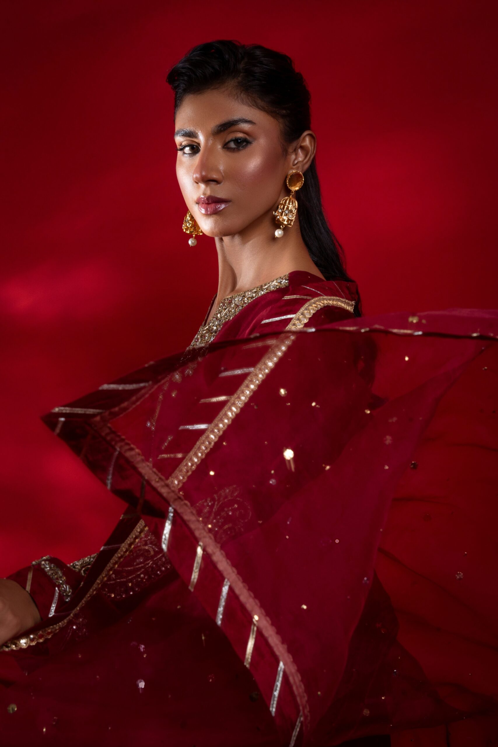 Zehra, an ode to timeless grandeur – crafted from pure silk and adorned with delicate embellishments that capture the essence of tradition. The ensemble is paired with a pure organza dupatta, shimmering with understated grace.